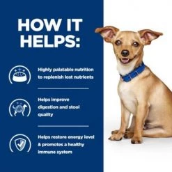 Recommended for: Acute gastroenteritis (diarrhoea or vomiting). Constipation (motility impaired). Flatulence – Gastritis (acute or chronic). Gastrointestinal disorders in puppies. Oesophageal disorders. Recovery from gastrointestinal surgery. Growth – Cushing’s syndrome. Diabetes, underweight.