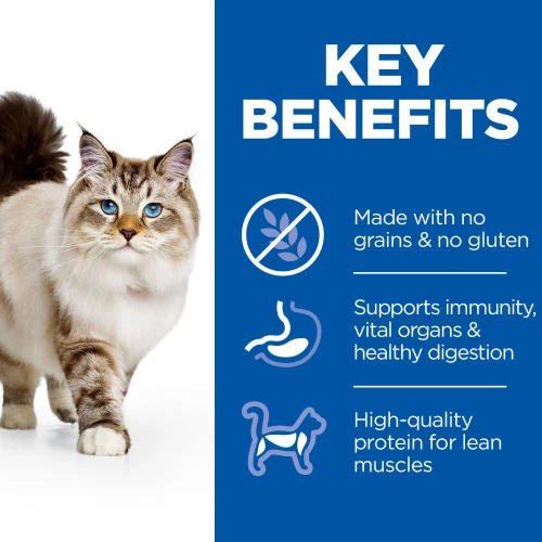 Hills Science Plan No Grain Chicken & Potato Dry Adult Cat Food is a delicious grain free kibble that contains high-quality protein to maintain lean muscle. Provides vitamin E and omega-3 & -6 fatty acids for healthy skin, and balanced minerals to support healthy vital organs.