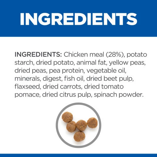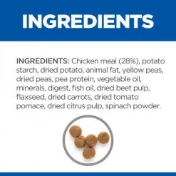 Chicken meal (28%), potato starch, dried potato, animal fat, yellow peas, dried peas, pea protein, vegetable oil, minerals, digest, fish oil, dried beet pulp, flaxseed, dried carrots, dried tomato pomace, dried citrus pulp, spinach powder.