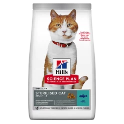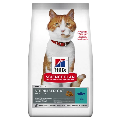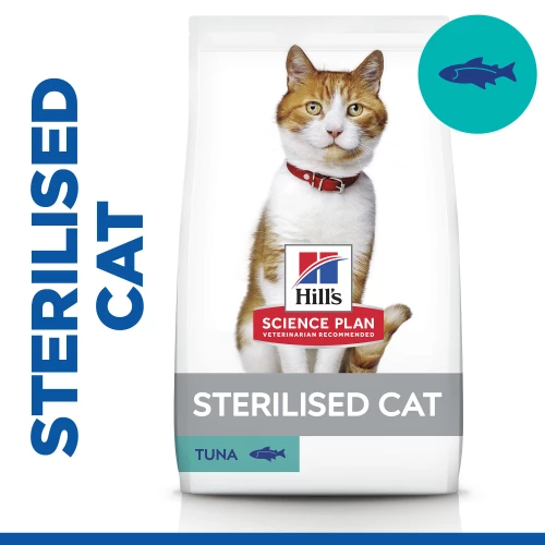 Hills Science Plan Sterilised Dry Tuna Adult Cat Food provides a unique weight management formula to keep your sterilised cat lean. After sterilisation, cats may suffer from weight gain, as well as an increased likelihood of urinary problems. At the same time, appetite increases and energy needs decrease.
