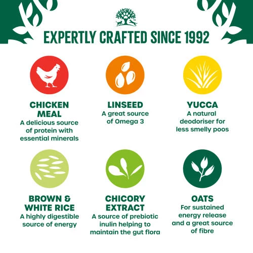 Chicken meal* (21.5%), brown rice* (20.5%), white rice* (20.4%), naked oats* (16%), whole linseed* (4.5%), chicken fat* (4.2%), sugar beet pulp*, chicken gravy (2.9%), pea starch, alfalfa meal*, seaweed*, pea fibre*, fish oil*, potassium chloride, sodium chloride, chicory extract* (0.1%), calcium carbonate, yucca extract* (0.02%). *Natural ingredients.