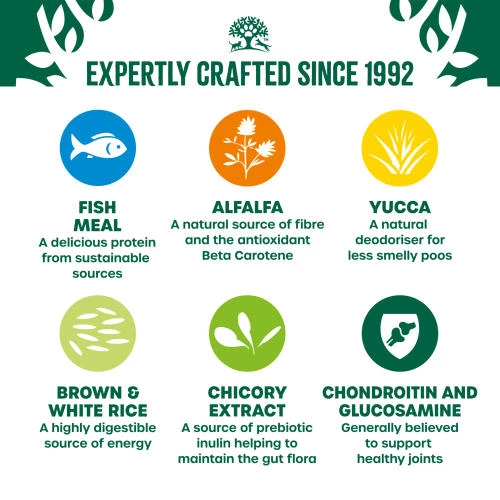 Brown rice (34.1%), fish meal*** (16%), barley, white rice (15.1%), whole linseed, fish stock (3.8%), peas, olive oil, fish oil (1.5%), alfalfa meal, chicory pulp, seaweed, pea fibre, potassium chloride, nettles (0.125%), parsley (0.125%), sodium chloride, chicory extract (0.1%), calcium carbonate, glucosamine (0.045%), yucca extract (0.02%), chondroitin (0.005%), green tea extract (0.004%), pomegranate extract (0.001%), rosemary extract (0.001%). ***Sustainably sourced, predominantly ocean white fish.