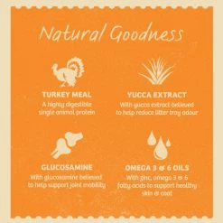 Turkey 41%, Pea protein, Tomato pomace, Cassava, Potato flakes, Sunflower oil, Calcium carbonate, Linseed oil ,Potassium disphosphate, Potassium chloride, Fish oil, Xylose Chicory extract, Cranberry extract 0.014%, Glucosamine 0.01%, Yukka exctract