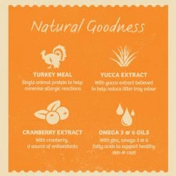 Turkey 41%, Pea protein, Tomato pomace, Cassava Potato flakes, Sunflower oil , Linseed oil, Potassium diphosphate, Calcium carbonate, Potassium chloride, Fish oil, Xylose, Chicory extract, Cranberry extract 0.014%, Yucca extract