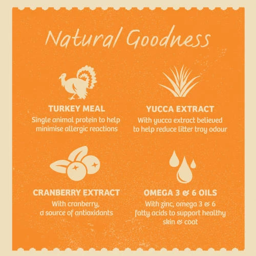 We take a handful of ingredients from nature, one source of animal protein and combine them with all the vitamins and minerals your cat needs. And all the great taste it deserves. For added peace of mind, it’s naturally hypoallergenic so less likely to cause an adverse food reaction, made without cereals such as rice and barley for those more sensitive cats and you will never see any added artificial colours, flavours or preservatives. Not now, not ever.