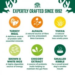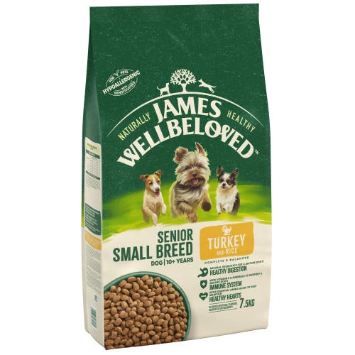 James Wellbeloved Small Breed Turkey & Rice Senior Dry Dog Food is a complete dry food that is hypo-allergenic. With selected protein source turkey and selected carbohydrate sources of rice and barley, it is a dietetic food, excellent for the reduction of ingredient and nutrient intolerances.