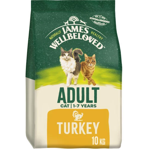 James Wellbeloved Turkey Dry Adult Cat Food is a tasty, healthy recipe of turkey and rice, loaded with everything your cat needs for glossy fur and to stay healthy from nose to tail.