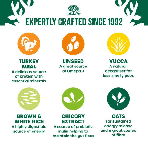 Turkey meal 23.3%, Brown rice 22.3%, White rice 22.0%, Naked oats, Whole linseed, Sugar beet pulp, Turkey fat 3.0%, Turkey gravy 2.9%, Alfalfa meal, Pea fibre, Seaweed 0.5%, Sodium chloride, Omega supplement ,Potassium chloride, chicory extract 0.1%, Calcium carbonate, Yucca extract