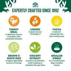 Turkey meal (27.5%), white rice (25%), naked oats, brown rice (11.2%), turkey fat (5%), sugar beet pulp, whole linseed, turkey gravy (2.9%), alfalfa meal, tomato pomace, carrots, seaweed, dried vegetarian stock, sodium chloride, fish oil, potassium chloride, chicory extract (0.1%), calcium carbonate, green tea extract (0.053%), cranberry extract (0.05%), yucca extract, rosemary extract (0.001%), pomegranate extract (0.001%).