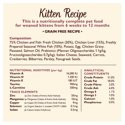 75% Chicken and Fish: Fresh Chicken (50%), Chicken Liver (15%), Freshly Prepared Seasonal White Fish (10%), Potato, Egg, Chicken Gravy, Flaxseed, Salmon Oil, Prebiotics (Mannan Oligosaccharides 1.1g/kg, Fructooligosaccharides 0.7g/kg), Italian Cheese, Seaweed, Carrots, Cranberries, Bilberries, Parsley, Fenugreek Seeds