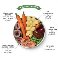 Ingredients: 60% Freshly Prepared: Turkey (30%), Herring (15%), Salmon (15%). Potatoes (4%), Peas, Carrots, Spinach, Vitamins & Chelated Minerals, Hemp Oil. Botanicals & Herbs: Golden Rod, Nettle, Aniseed, Celery Seed, Rosehips, Marigold Petals, Cleavers, Seaweed, Alfalfa, Milk Thistle, Dandelion Root, Burdock Root.