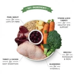 Ingredients: Fresh Chicken 45%, Freshly Prepared Turkey 15%, Carrots (2%), Squash (2%), Pearl Barley (1%), Brown Rice, Apples, Broccoli, Peas, Blueberries (1%), Flaxseed, Vitamins & Chelated Minerals. Botanicals & Herbs: Golden Rod, Nettle, Aniseed, Celery Seed, Rosehips, Marigold Petals, Cleavers, Seaweed, Alfalfa, Milk Thistle, Dandelion Root, Burdock Root.