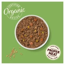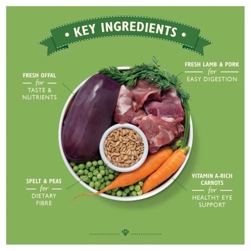 Produced from 100% controlled organic farming (meat content 55% including: organic lamb 30%, organic beef 10%, organic pork 10%, organic chicken 5%), vegetables 4% (organic carrots and organic peas), organic spelt, organic alfalfa, organic cleavers, organic spirulina, organic kelp, vitamins and minerals.Vitamin E (alpha tocopherol) 15mg, Copper (as Copper Sulphate) 1mg, Zinc (as Zinc Oxide) 20mg.