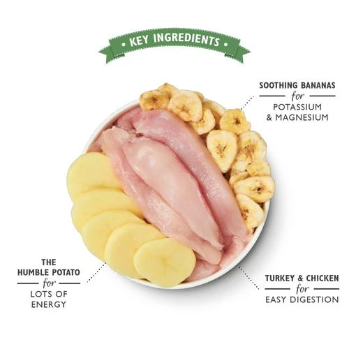 Ingredients: 50% Fresh Chicken, Potatoes (11%), Bananas (9%), Vitamins & Chelated Minerals, Prebiotics FOS & MOS.