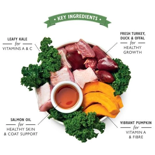 Composition Freshly Prepared: Turkey (41%), Duck (20%), Sweet Potatoes (4%), Pumpkin, Kale (2%), Cranberries, Potatoes, Carrots, Vitamins & Chelated Minerals, Salmon Oil (0.5%). Botanicals & Herbs: Golden Rod, Nettle, Aniseed, Celery Seed, Rosehips, Marigold Petals, Cleavers, Seaweed, Alfalfa, Milk Thistle, Dandelion Root, Burdock Root.