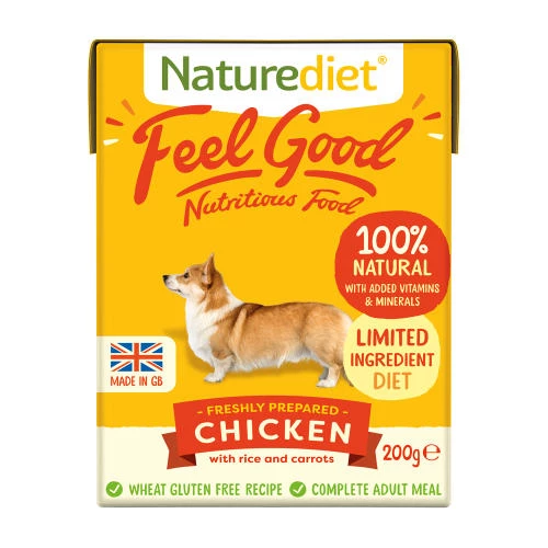 Naturediet Feel Good Chicken is naturally delicious wet food is a gentle recipe of chicken, rice and carrots. A nourishing, complete meal for sensitive tummies; 100% complete, nutritionally balanced and natural, and contains all the essential nutrients your dog needs for a healthy diet.