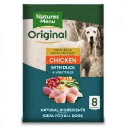Natures Menu Chicken & Duck pouches are a delicious, natural, & complete dog food made with fresh chicken, game meat and vegetables. Free from artificial colours, flavours and preservatives, each pouch is filled with quality raw ingredients before being sealed and gently steamed, ensuring all the nutrients are locked in tight.