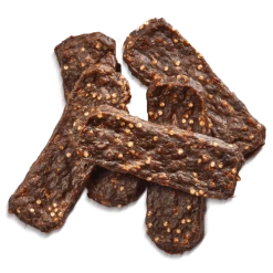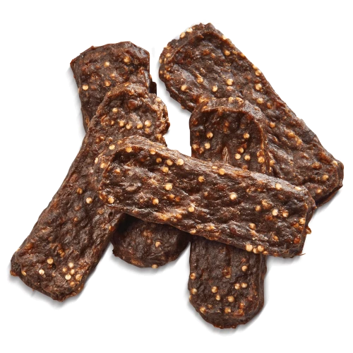 Ingredients: Beef (75%), Glycerine, Pea Protein, Quinoa (4%), Distilled White Vinegar, Minerals, Dried Spinach (4%), Red Beet Powder, Flaxseed, Dried Sweet Potato (0.1%), Orange Zest, Vegetable Oil.
