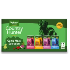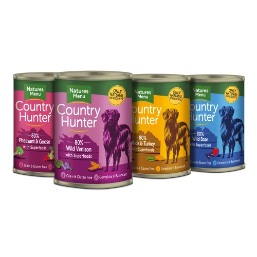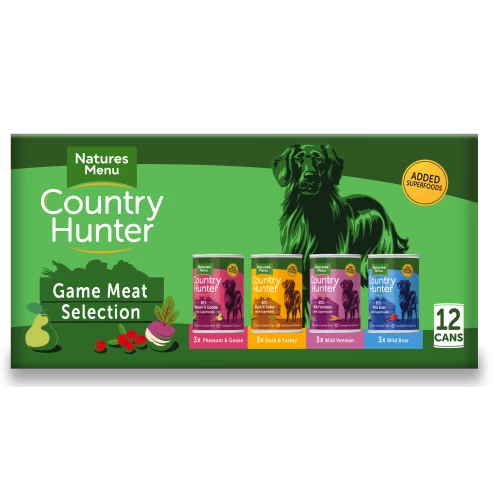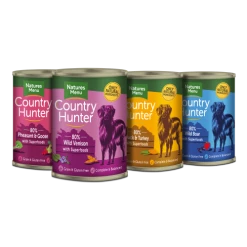 Natures Menu Country Hunter Game Meat Selection Wet Adult Dog Food are a seriously meaty and delicious selection of duck & turkey, pheasant & goose, wild boar and wild venison, all blended with high quality fruit, veg and superfoods for a variety of tastes your dog will find irresistible.