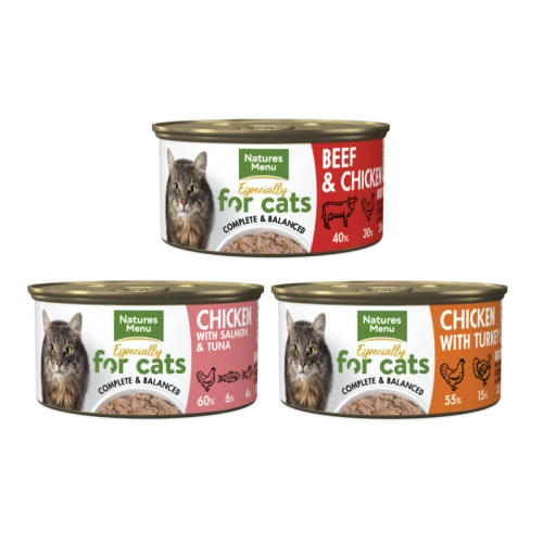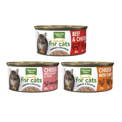 Free from common fillers like wheat, corn, bran, and soya, Natures menu pouches contain a minimum of 71% meat – and no meat derivatives. With chicken as an easily digested source of protein rich in amino acids, as well as salmon & tuna, beef, or turkey.