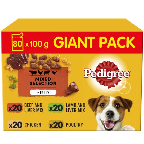 Pedigree Mixed Selection in Jelly Wet Adult Dog Food are a selection of fresh succulent meals which provide your dog with a complete balance of vitamins and minerals to keep them fit and healthy. With recipes made to promote four key areas, bones, digestion, skin and coat and the immune system which helps provide your dog with the building blocks they need to grow and develop, you will soon see their personality shine.