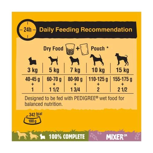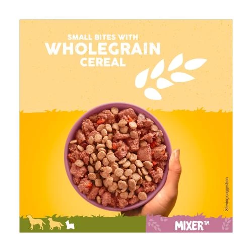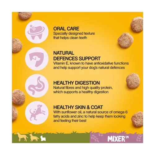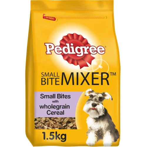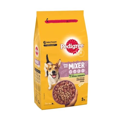 Pedigree Small Bite Mixer Original Adult Dog Food is a delicious way to compliment a wet food add extra depth in flavour and crunch in texture. Designed to help support the growth and development of your dog the small bite dry mixer offers complete nutritional balance in a smaller kibble for little jaws. Combined with a wet food which high in moisture content with less calorie density the dry mixer helps increase nutritional value and look after your dog’s dental hygiene.