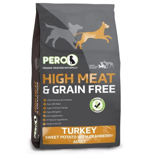The Pero High Meat & Grain Free Turkey, Sweet Potato & Cranberry Adult Dog Food is a delicious, complete and balanced food that’s great for pooches with sensitive digestive issues or grain allergies.