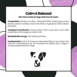 Pooch & Mutt Calm & Relaxed Dog Treats are delicious, hand-baked mini bones made with lamb, chamomile and l-tryptophan as natural aids to a sleepy pooch.