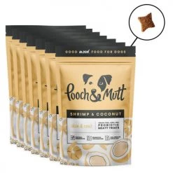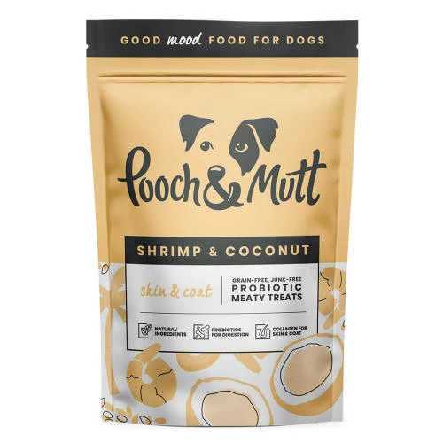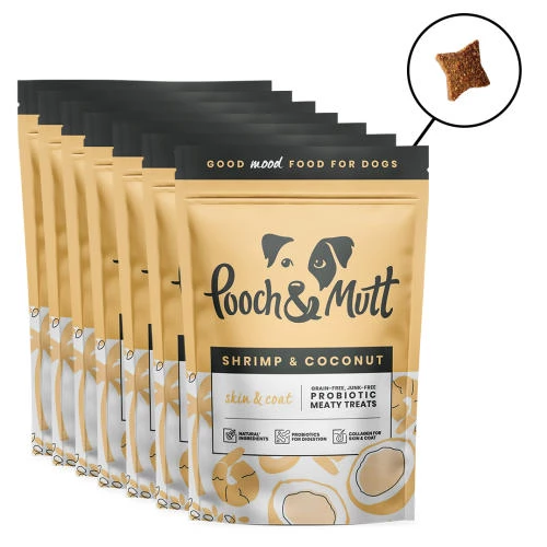 Pooch & Mutt Meaty Treats Shrimp & Coconut Skin & Coat Dog Treats are for the culinary connoisseurs of the pack these healthy treats containing a unique combination of Shrimp & Coconut are for pooch’s with taste. These are the perfect snack for those dogs that are prone to dry or itchy skin or who may need a little bit of help developing their glossy coat.