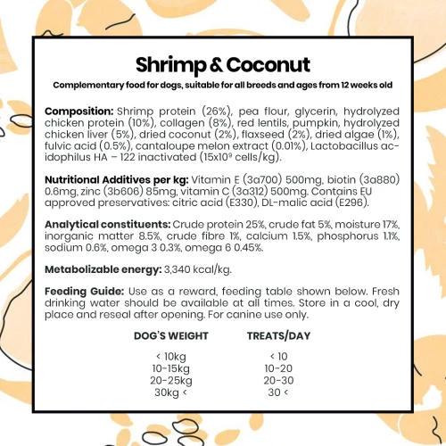 For the culinary connoisseurs of the pack, these healthy treats containing a unique combination of Shrimp & Coconut are for pooches with taste. These are the perfect snack for those dogs that are prone to dry or itchy skin or who may need a little bit of help developing their glossy coat. Naturally Hypoallergenic. These treats are formulated with no added artificial flavours, colours or preservatives, with no grain, cereal, gluten, beef, soy, dairy and non-GM produce.