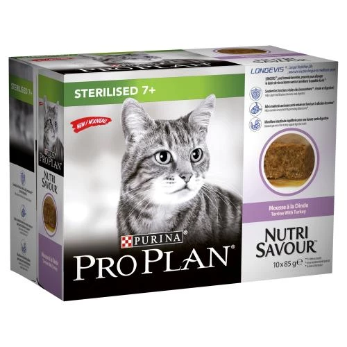 Pro Plan Sterilised Senior Adult 7+ is a complete wet cat food scientifically formulated to support healthy ageing in cats over 7 years old. It contains Longevis, a patented nutrient blend including antioxidants, a prebiotic, and omega-3 and omega-6 fatty acids, proven to help extend healthy lifespan and improve quality of life in cats aged 7+. Each pouch offers all the essential nutrients your cat needs to thrive as well as great taste of tender protein-rich chunks of Turkey.