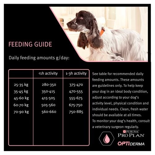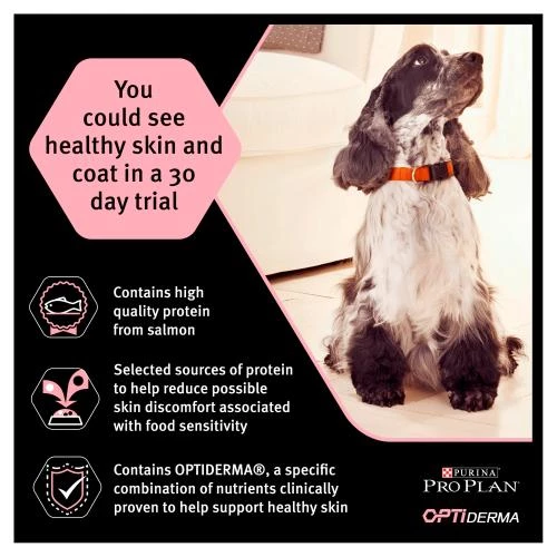 PRO PLAN OPTIDERMA Salmon Sensitive Skin Large Breed Robust Adult Dog Food is for pooches who have a tendency to itch and scratch more than others. And they may experience more dandruff. Developed by our vets and nutritionists, PURINA PRO PLAN with OPTIDERMA is formulated without gluten and provides advanced nutrition that supports the sensitive skin of adult large dogs with robust physique. OPTIDERMA includes a special combination of skin targeting nutrients proven to support healthy skin and beautiful coat and selected sources of protein to help reduce possible skin reactions associated with food sensitivity.