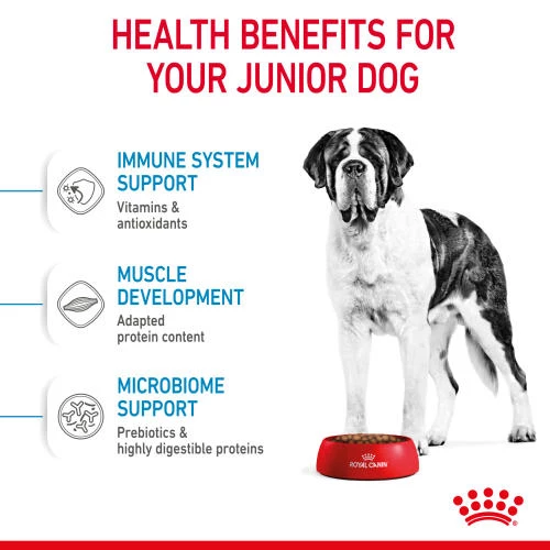 ROYAL CANIN Giant Junior contains an adapted protein content to help support muscle development from 8 to 18/24 months of age. It also contains nutrients such as vitamins C and E to support natural immunity. Extra-large dogs may have sensitive digestive systems. A combination of beneficial prebiotics (such as FOS, MOS and beet pulp) and highly digestible proteins, helps to support a healthy balance of intestinal microbiota (gut flora) for good digestion. Additionally, the formula has precise levels of minerals, including calcium and phosphorus, to support the development of strong and rapidly growing bones. The kibble in ROYAL CANIN Giant Junior has also been designed to encourage a slower speed of ingestion.