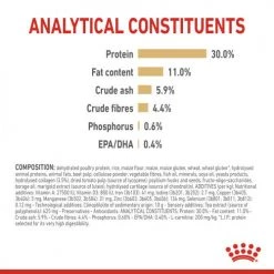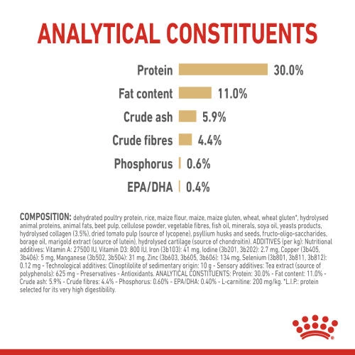 Dehydrated poultry protein, rice, maize flour, maize, maize gluten, wheat, wheat gluten*, hydrolysed animal proteins, animal fats, beet pulp, cellulose powder, vegetable fibres, fish oil, minerals, soya oil, yeasts products, hydrolysed collagen, dried tomato pulp (source of lycopene), psyllium husks and seeds, fructo-oligosaccharides, borage oil, marigold extract (source of lutein), hydrolysed cartilage (source of chondroitin). * L.I.P.: protein selected for its very high digestibility. Vitamin A: 27500 IU, Vitamin D3: 800 IU, Iron (3b103): 41 mg, Iodine (3b201, 3b202): 2.7 mg, Copper (3b405, 3b406): 5 mg, Manganese (3b502, 3b504): 31 mg, Zinc (3b603, 3b605, 3b606): 134 mg, Selenium (3b801, 3b811, 3b812): 0.12 mg. Tea extract (source of polyphenols): 625 mg – Preservatives – Antioxidants. Clinoptilolite of sedimentary origin: 10g.
