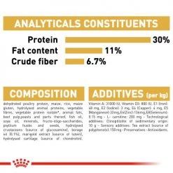 Dehydrated poultry protein, maize, rice, maize gluten, hydrolysed animal proteins, vegetable fibres, vegetable protein isolate*, animal fats, beet pulp, yeasts and parts thereof, fish oil, soya oil, minerals, fructo-oligosaccharides, psyllium husks and seeds, hydrolysed crustaceans (source of glucosamine), borage oil (0.1%), marigold extract (source of lutein), hydrolysed cartilage (source of chondroitin). *L.I.P.: protein selected for its very high digestibility. Vitamin A: 31000 IU, Vitamin D3: 800 IU, E1 (Iron): 48 mg, E2 (Iodine): 3 mg, E4 (Copper): 4 mg, E5 (Manganese): 33 mg, E6 (Zinc): 136 mg, E8 (Selenium): 0.15 mg – L-carnitine: 200 mg – Technological additives: Clinoptilolite of sedimentary origin: 10g – Sensory additives: Tea extract (source of polyphenols): 150 mg – Preservatives – Antioxidants.
