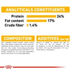 Composition: Rice, wheat gluten, wheat, animal fats, maize, husked oats, maize gluten, hydrolysed poultry liver, minerals, soya oil, beet pulp, fish oil (source of EPA and DHA), flax seeds (source of omega 3), fructo oligosaccharides, borage oil (source of gamma-linolenic acid), marigold extract (source of lutein). Crude ash: 1.4%. Crude fibre: 1.7%. Crude oil fats: 1.4%. Moisture: 0%. Protein: 24%.