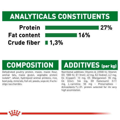 Additives: Vitamin A: 22000 IU, Vitamin D3: 1000 IU, E1 (Iron): 41 mg, E2 (Iodine): 4.1 mg, E4 (Copper): 13 mg, E5 (Manganese): 54 mg, E6 (Zinc): 133 mg, E8 (Selenium): 0.1 mg, L-Carnitine: 50.0 mg – Preservatives – Antioxidants. * L.I.P.: protein selected for its very high digestibility.