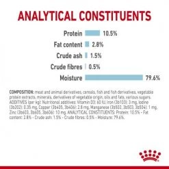 Meat and animal derivatives, cereals, fish and fish derivatives, vegetable protein extracts, minerals, derivatives of vegetable origin, oils and fats, various sugars. Crude ash: 1.5%. Crude fibre: 0.5%. Crude oil fats: 2.8%. Moisture: 79.6%. Protein: 10.5%.