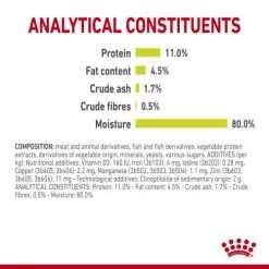 Meat and animal derivatives, vegetable protein extracts, cereals, minerals, derivatives of vegetable origin, yeasts, oils and fats. Crude ash: 1.6%. Crude fibre: 0.5%. Crude oil fats: 2.8%. Moisture: 79.5%. Protein: 11.5%.