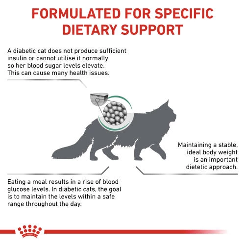Royal Canin Veterinary Diets Diabetic Dry Adult Cat Food is a complete dietetic feed for cats formulated to regulate glucose supply diabetes mellitus. This feed contains a low level of rapid glucose releasing carbohydrates.