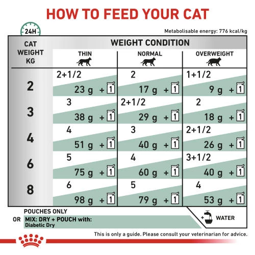 ROYAL CANIN Feline Diabetic in Gravy is specially formulated with your diabetic adult cat’s nutritional needs in mind. ROYAL CANIN Feline Diabetic in Gravy supports the healthy management of postprandial blood glucose (the sugar in your cat’s blood after eating). This is thanks to reduced levels of starch and a low glycaemic index. Overweight cats are usually less sensitive to the effects of insulin, so managing their weight often results in a more effective response to diabetic treatment. ROYAL CANIN Feline Diabetic in Gravy is specifically tailored with a high level of protein and moderate calorie content to support a healthy body weight. As part of the ROYAL CANIN Veterinary Range, it is important that this product is only given to your pet when recommended by a veterinary professional.