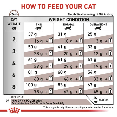 This formula contains high quality nutrients and an optimal balance of fibres to support healthy digestive transit. ROYAL CANIN Gastrointestinal formula is highly palatable, even to cats with a decreased appetite. ROYAL CANIN Gastrointestinal is formulated with a high energy content. This helps to reduce the volume of each meal, which decreases the intestinal load and makes digestion easier for your cat. As part of the ROYAL CANIN Veterinary Range, it’s important that this product is only given to your pet when recommended by a veterinary professional.