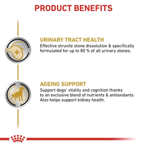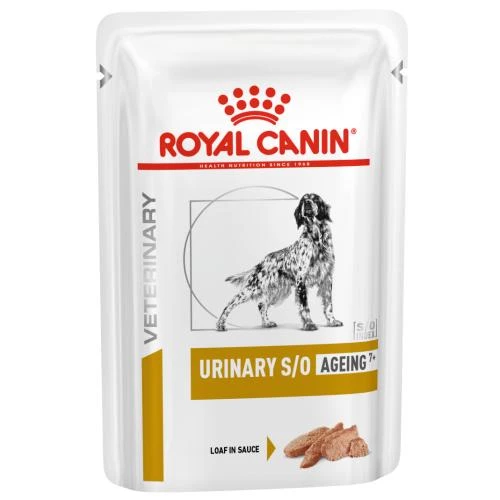Royal Canin Veterinary Diets Urinary SO Ageing 7+ in Loaf Wet Dog Food is a nutritionally complete diet that’s been formulated to dissolve urinary stones in senior dogs as well as helping to support dogs’ vitality and cognitive health.
