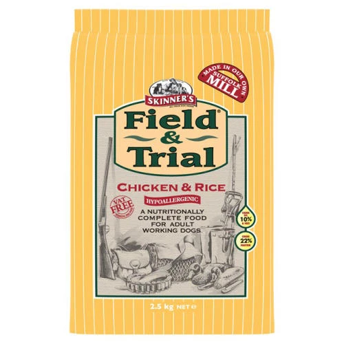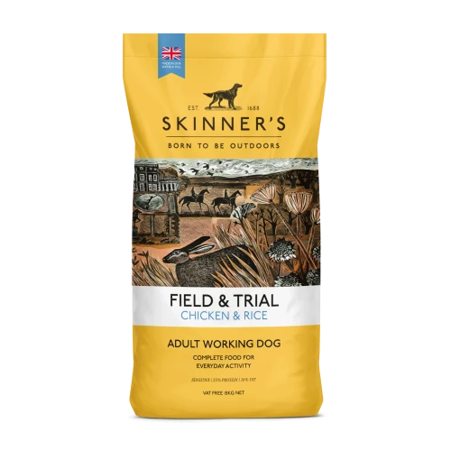 Skinner’s Field & Trial Chicken & Rice is a tasty hypoallergenic food designed to cater to the high energy demands of working and active dogs. As a working dog food, Field & Trial is VAT free. Eschewing common causes of irritation and allergies such as wheat, maize and barley gluten, soya, and dairy, Field & Trial Chicken & Rice helps to minimize skin, coat, and digestive sensitivities.
