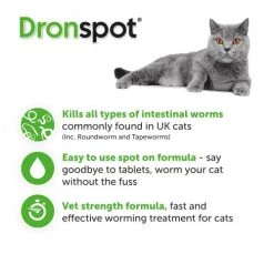Worming your cat is made easy with Dronspot – a spot on application that kills every type of intestinal worm commonly found in UK cats. Fuss-free deworming without tablets, gives you peace of mind that you are helping keep worms at bay from your pet and family.