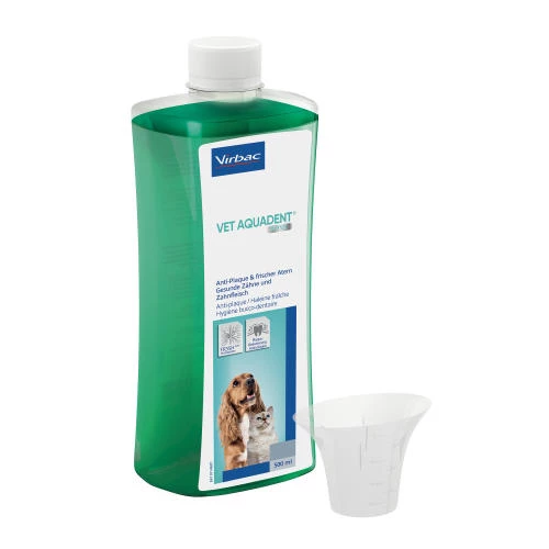 Virbac Vet Aquadent FR3SH is a vet created, fuss free way of fighting the formation of plaque and tartar on your cat’s or dog’s teeth, as well as helping to prevent bad doggy or moggy breath. Just add to your pet’s drinking water – 5ml per 500ml of fresh water – Aquadent is easy to use and highly effective