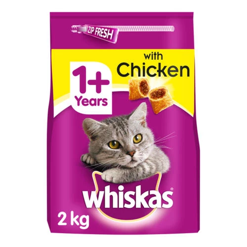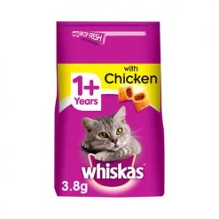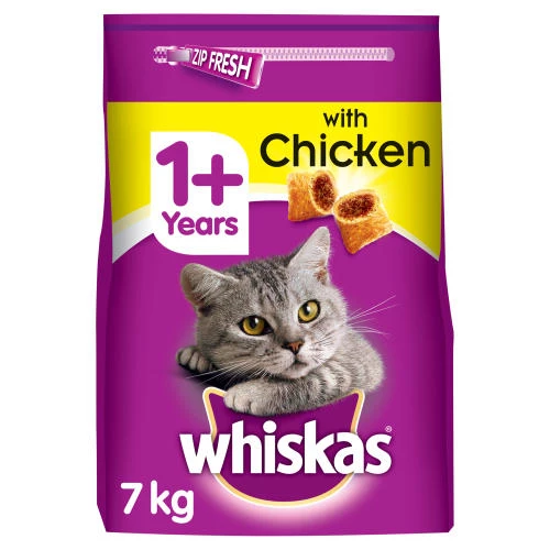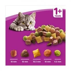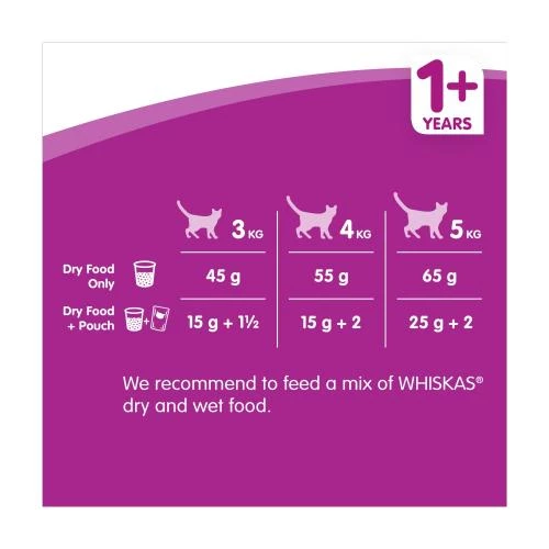 Whiskas 1+ Dry cat food is a nutritionally complete and balanced meal for your adult feline. This adult cat food contains tasty filled pocket kibbles they will love – crunchy on the outside with a soft and delicious centre. Whiskas 1+ quality dry cat food provides everything your adult cat nutritionally needs for a long and happy life. Whiskas delicious cat food meals and cat treats are formulated for your cat’s diet. A 100% Complete and Balanced cat food of chicken dry cat kibbles.