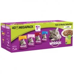Whiskas 1+ Fish & Meaty Selection in Jelly Wet Adult Cat Food are delicious pouches of tender meat and fish pieces in succulent jelly. Including Chicken, Salmon, Beef and Tuna. Whiskas put quality meat and fish in their recipes not only because cats love it but also because it is a great source of natural protein, vitamins and minerals.