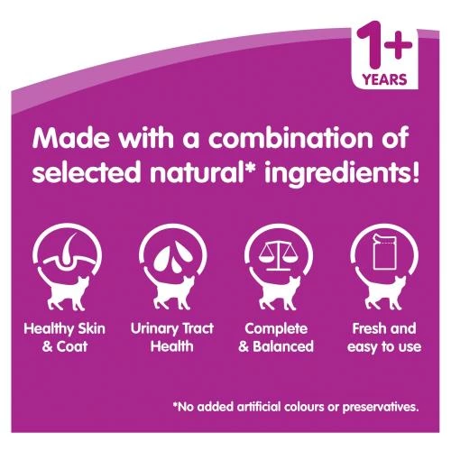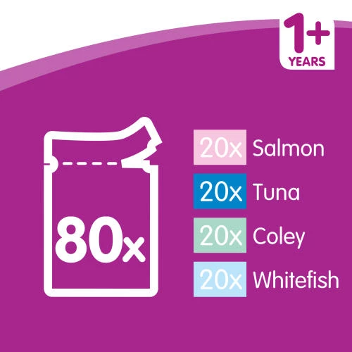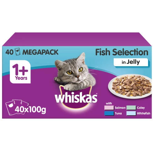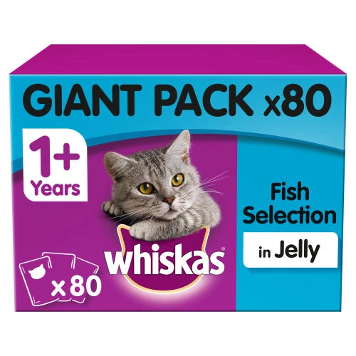 Whiskas 1+ Fish Selection in Jelly Wet Adult Cat Food are tempting fish recipes specially created to suit the needs of your cat, providing all the nutrition and energy she needs to live life to the full. Each pouch is nutritionally complete and balanced, with mineral levels to support a healthy urinary tract and zinc to care for your cat’s skin and product a glossy coat.