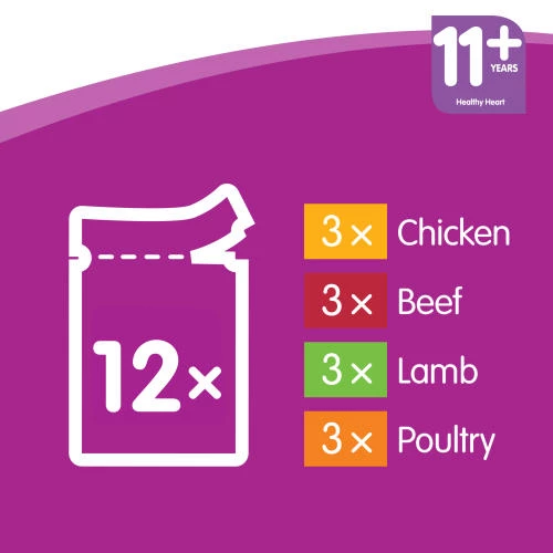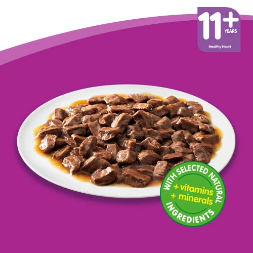Whiskas 11+ Meaty Selection in Gravy Senior Cat Food Pouches are a delicious assortment of meaty meals for super senior cats that’s easy to eat and optimal to digest for your ageing cat.